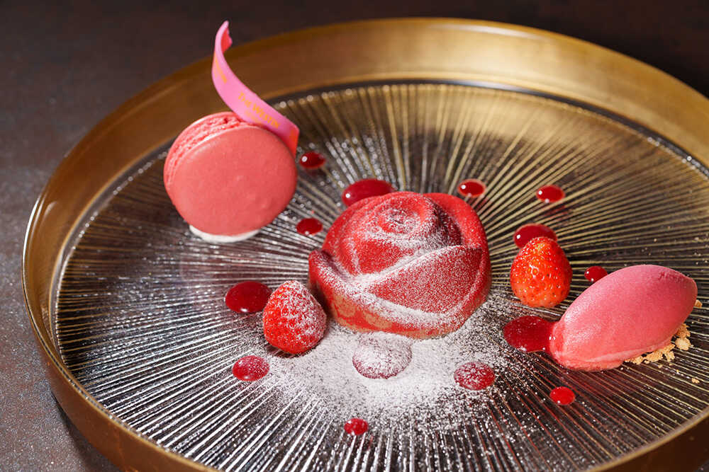 食事の締めくくりは、思わずため息がこぼれるほど美しいデザート。真紅のバラをイメージしたムースには、ピスタチオのブリュレが隠されており、添えられた宮城県産いちごのソルベとともに、甘く繊細な余韻を残す。