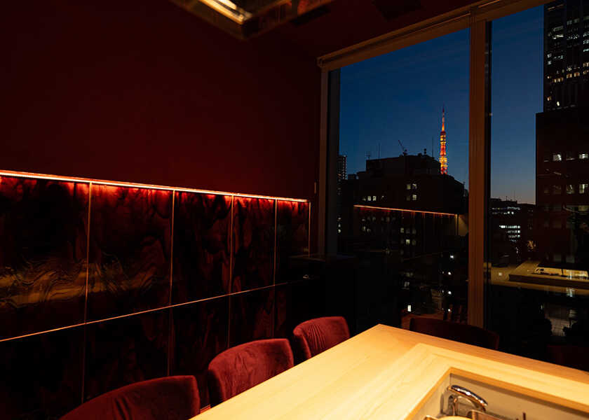 赤を基調とした上質なカウンター6席のみの空間。余計な演出を排し、木の温もりと柔らかな照明が織りなす静謐な時間が流れる。窓の向こうに東京タワーの灯がきらめく中、職人が一貫ずつ鮨を握る。まさに、喧噪から切り離された“大人のための隠れ家といえるだろう。