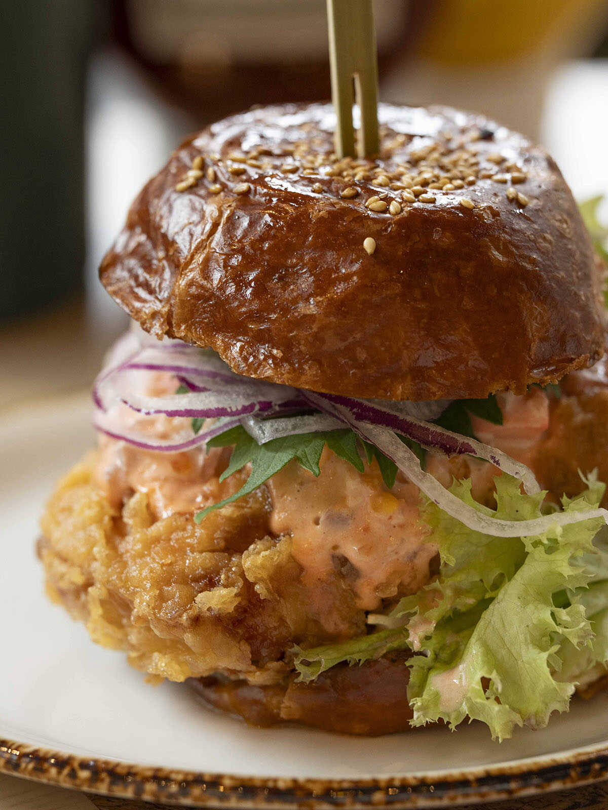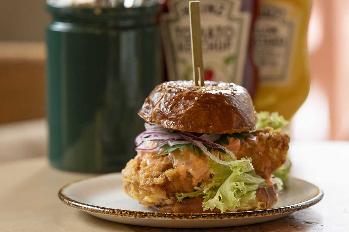 なんば・大阪の限定復刻メニュー“裏なんバーガー”(1540円)の主役は、柔らかな鳥をカリッと揚げたボリューミーなチキン南蛮。大阪の遊び心を表現するかのように、ソースはなんと梅。ジューシーなチキンをほどよくさっぱりしてくれる洋と和のバランスが最高だ。ちょっと甘みがあるバンズもあいまって、ひとつでいろんな味が楽しめる個性的なバーガー。一度は食べてみるべき、大阪を感じる逸品!