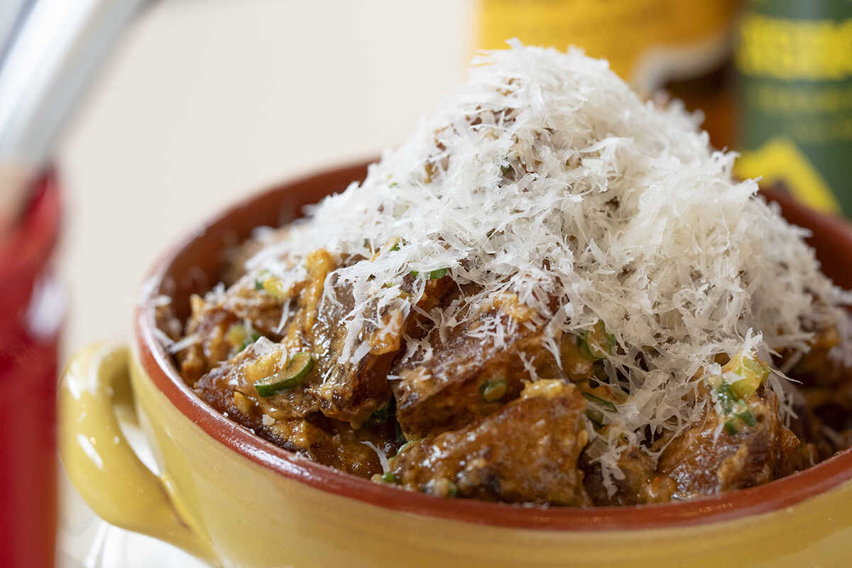 マッシュ感のある揚げたポテトにサワークリームの酸味とチーズの濃厚さがガツンとくる、“ハラペーニョパルメザンポテト”(880円)。スモークパプリカやハラペーニョピクルス、パルメザンチーズに玉ねぎコンフィ、ニンニクなど、美味しさを刺激する素材がたくさん入っているので、もう、手が止まらない!