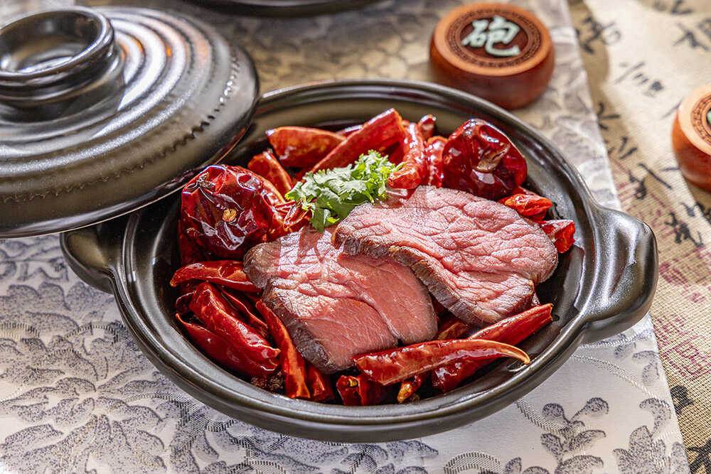 趣のあるスタンドに並ぶのは、物語性を帯びた前菜の品々。例えば、クラゲと燻製鴨を合わせた『貂蝉の艶』は、絶世の美女・貂蝉の妖艶さをローズ香るザクロソースで表現。蒸し鶏を3種のソースで楽しむ『桃園の誓い』は、劉備・関羽・張飛の義兄弟の契りを味覚でなぞる一皿。さらに、鮑を船に見立てた『草船借箭』など、歴史的名場面が料理として立ち上がる。