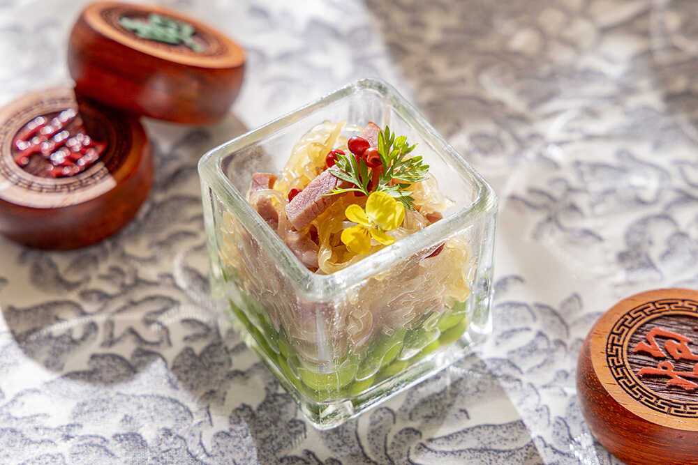 『貂蝉の艶』クラゲと燻製鴨の冷製 ローズ香るザクロソース/戦乱の世において、その美貌で戦局さえ動かしたと語られる貂蝉をモチーフにした一皿。枝豆の上にクラゲと燻製鴨を繊細に重ね、仕上げにバラがほのかに香る甘酸っぱいザクロソースを添えている