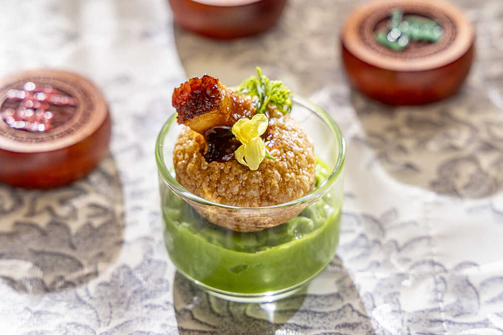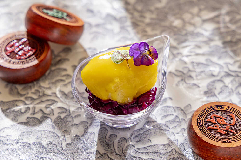 『呂布の一撃』ポークベリー 蜂蜜入り黒酢ソース パニプリ仕立て/『三国志』最強の武将と謳われる呂布。その“一撃で制する”圧倒的な存在感を表現したのが、この一品。薄く揚げた球状の生地・パニプリの中に、黒酢と蜂蜜でコク深く煮詰めたソースをまとわせたポークベリーを忍ばせている。ひと口で広がる力強い旨みと鮮烈なインパクトが、呂布の豪胆さを想起させる
