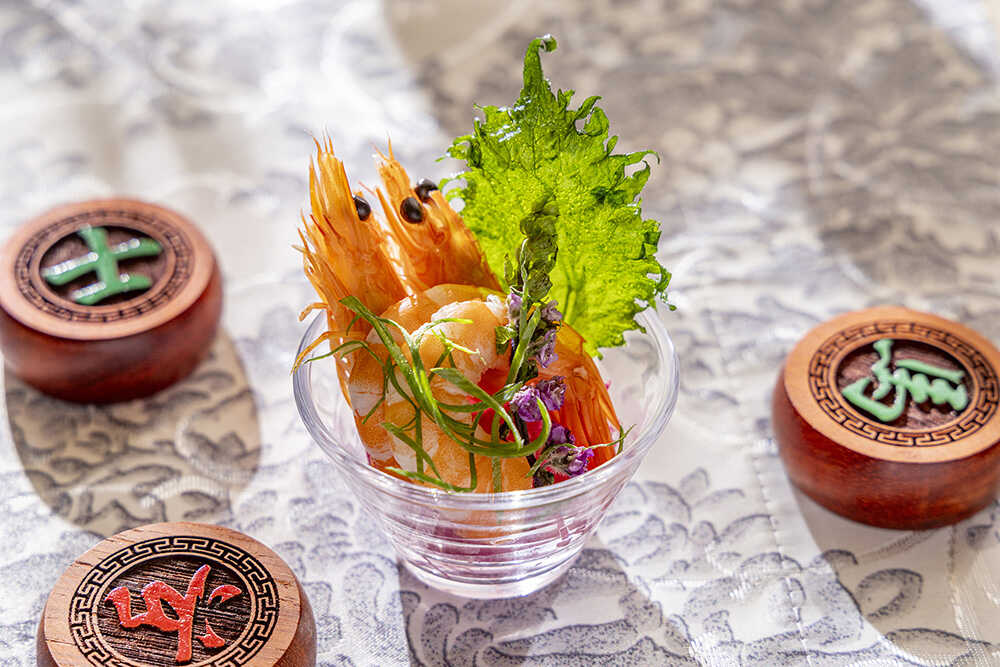 『曹操の策』甘エビのチャイニーズマリネ/魏の礎を築いた稀代の覇者・曹操の二面性に着想。英雄としての器と、冷徹な策士としての顔——そのコントラストを味覚で表現している。白髪ねぎと紅芯大根の上に、葱の香りをまとわせた塩で甘エビを軽やかにマリネ。最後に訪れる四川青山椒のピリリとした刺激がアクセントを添える
