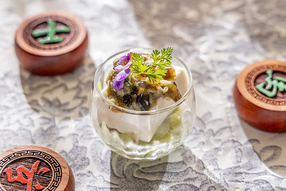 『諸葛亮の一手』葱生姜ソースのピータン豆腐/知略で戦局を動かした軍師の妙手に着想を得たもの。葱と生姜の香りを繊細にまとわせたピータン豆腐は、噛み進めるほどに奥行きのある旨みが広がる