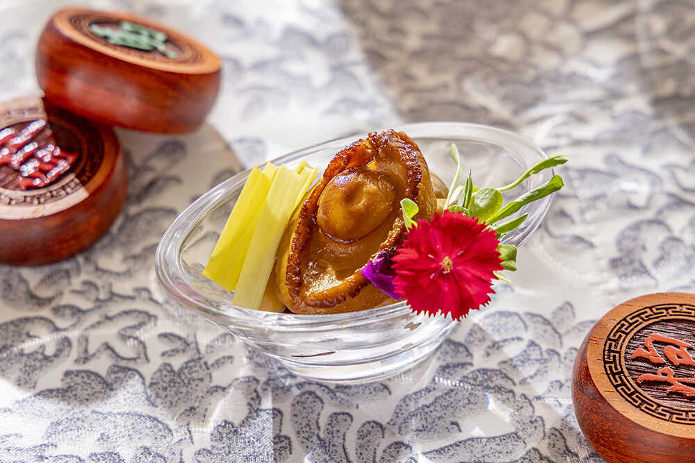 『草船借箭』鮑のオイスターソース掛け/敵陣から十万本の矢を“借りる”という諸葛孔明の奇策に着想。鮑を船に見立て、黄ニラともやしで無数の矢を表現。オイスターソースと醤油でやわらかく煮含めた鮑は、噛みしめるほどに濃密な磯の旨みが広がる