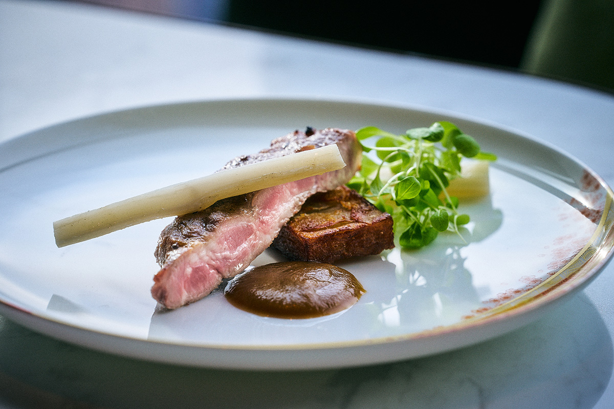メインディッシュのTURF(⼤地の恵み)には、ドリフトウッド バー&グリル〉ならではの、炭⽕で丁寧に焼き上げたグリルメニューを中⼼にご提供。炭⽕でグリルした上質な国産⽜に、醤油麹で旨味を加えたオランデーズソースといくらを添え、海と⼤地の恵みが⼀度に⼝の中に広がる"SURF&TURF エッグベネディクト"、⻄京味噌で旨味を出したポートワインソースと、和⽜脂で仕上げたマッシュポテトを添えた"オーストラリア産アンガスビーフサーロイン"、⿅児島県産恵味の⿊豚にほろ苦い旬のうどを合わせ、ほうじ茶で深みを出したアップルチャツネとお召し上がりいただく⼀品など、10種類より⼀⽫を選べるシステムとなっている。