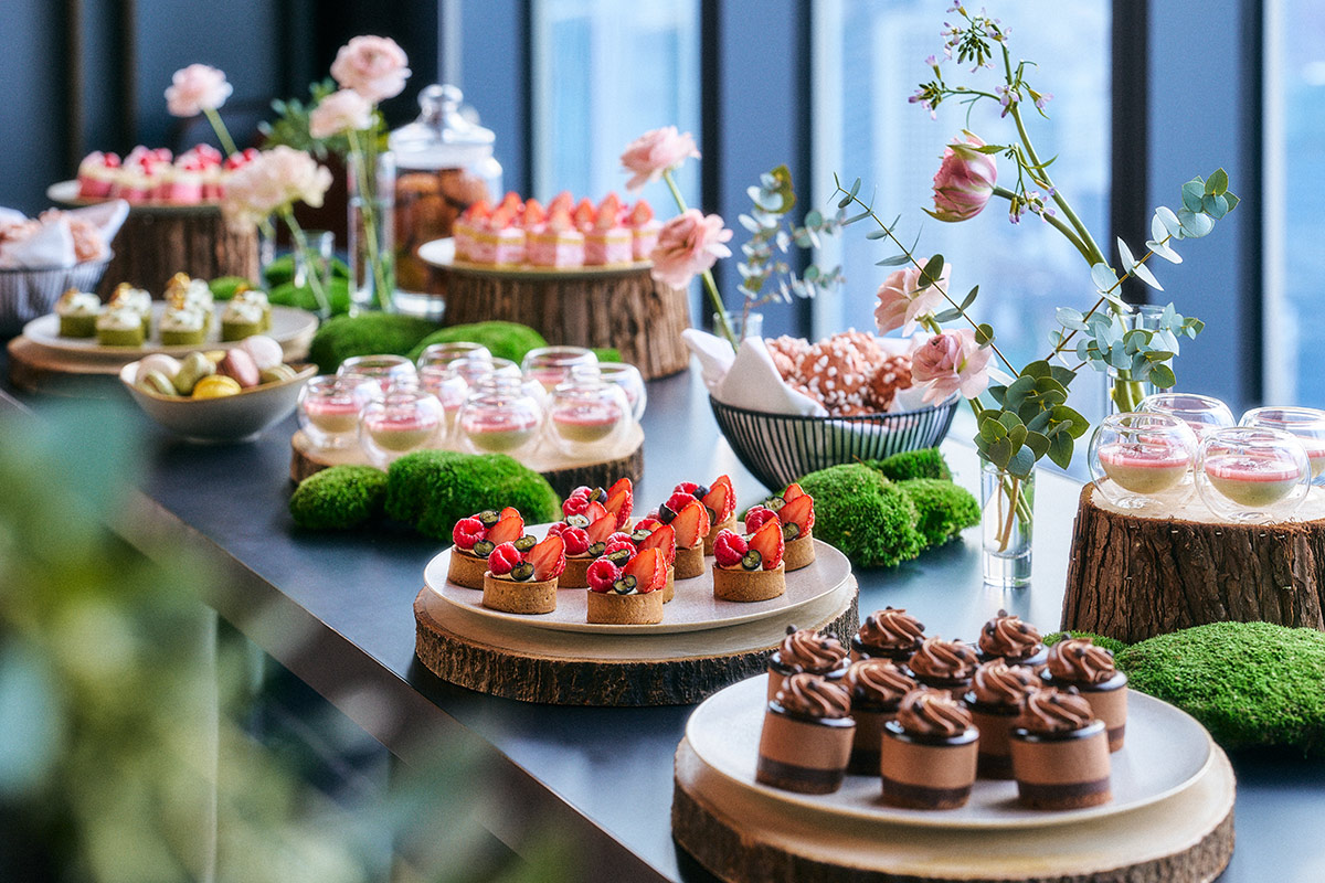 デザートには、春らしい桜のショートケーキや、コニャック⾹る桃のパンナコッタ、3 種のベリーの酸味にコクのあるバニラディプロマットクリームを合わせた"ベリーのタルト"など、今のシーズンは春を感じるスイーツをビュッフェで思う存分楽しめる。