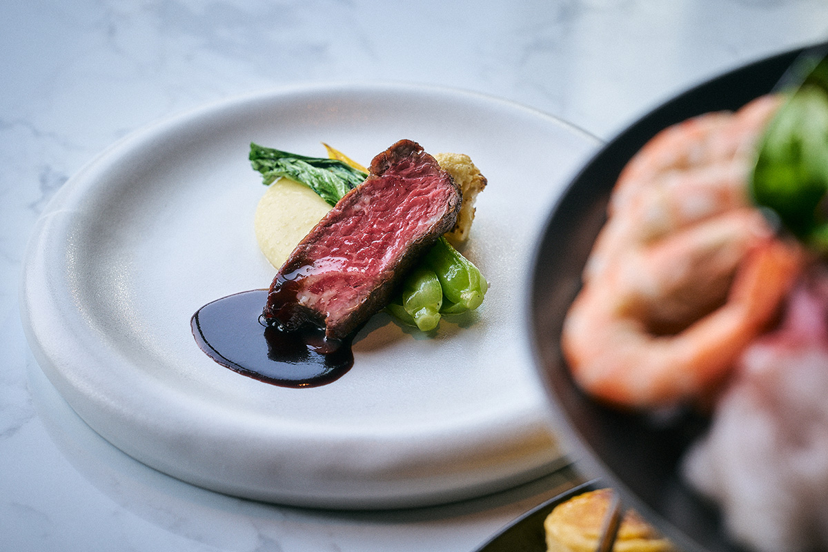 "フェアモント サンデーブランチ"の料理のテーマは、SURF&TURF(サーフ&ターフ)。海の恵みと⼤地の恵みをひと⽫に盛り付ける、遊び⼼あふれるアメリカ発祥の料理、SURF&TURFからインスピレーションを得て、東京湾の海の静けさと都⼼のエネルギーが調和する〈フェアモント東京〉ならではの料理を用意。