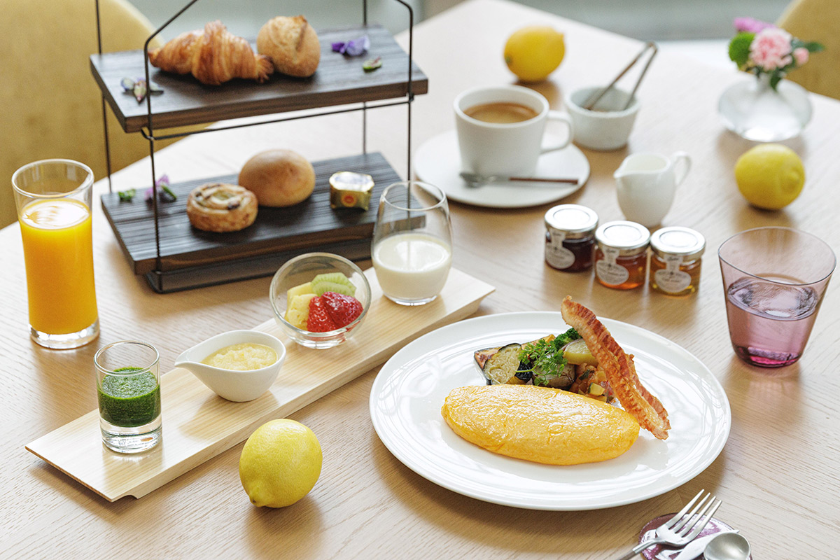 9:15 ザ・キタノホテル東京 「オランジュリー光庵」朝食(厳選卵、旬の野菜、スープ、自家製ヨーグルトなどの軽やかなメニュー)