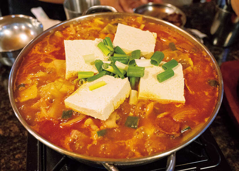 道祖の好物のひとつ“プデチゲ”を注文。ここは辛味とコクのバランスがよく、具だくさんで食べ応え十分。