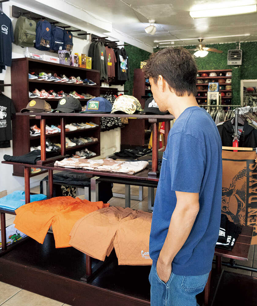 横乗り好きが集まるサンタクルーズらしいお店。〈ニューエラ〉や〈ベンデイビス〉など、ストリートブランドを取り扱う。