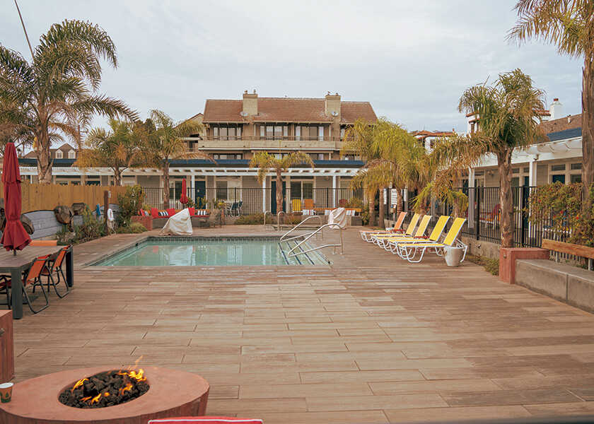 “サンタクルーズ・ビーチ・ボードウォーク”まで徒歩圏内にあるホテル。デッキにはプールやホットタブ(木製の大型浴槽)、焚き火台があり、最上のリラックスタイムを過ごせる。