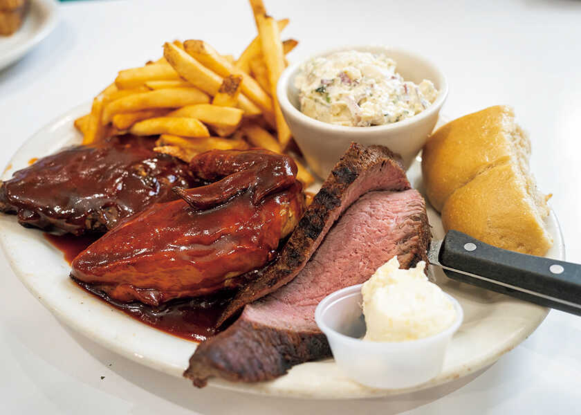 じっくりと薪で燻製したBBQチキン、スライスしたトライチップ、BBQベイビーバックリブの3種の肉を盛りつけた“トリプルBBQコンボ”。ガーリックバターと一緒に口へ運ぶと、よりパンチのある味わいを楽しめる。