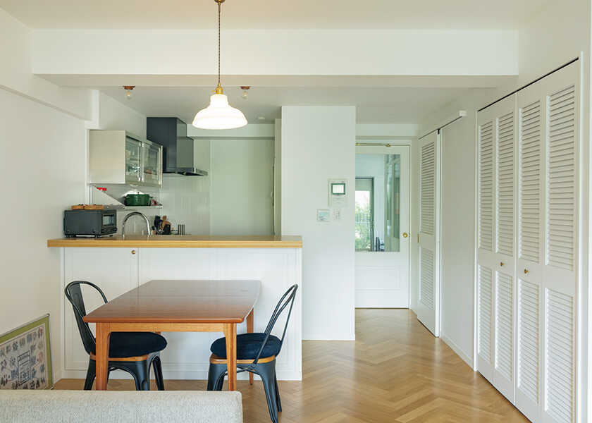周囲の環境や緑が豊かな建物のたたずまいが気に入って購入したマンション。築40年のこちらを見事にフルリノベーションした。以前の間取りは、10畳のリビングダイニングと袖壁で仕切られたキッチン、和室、ふたつの洋室という構成だった。リモートワークできるスペースを残しつつ、明るく開放的な住まいにしたかったため、天井は高さを出し細かく仕切られていた個室の壁を取り払ったうえで、内装を一新した。玄関横のひと部屋をなくし、広い玄関土間・ウォークインクローゼット・デスクスペースを効率よく配置。LDKはふたつの掃き出し窓を臨むオープンなレイアウトにした。
