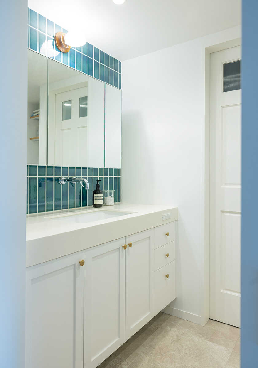 ウォッシュルームは釉薬の艶が美しいブルーグリーンのタイルを縦張りにして、シンプルな空間の差し色にした。足元の収納やドアは、いずれもモールディング(額縁)を施した。控えめな意匠がクラシカルで洗練された印象を生んでいる