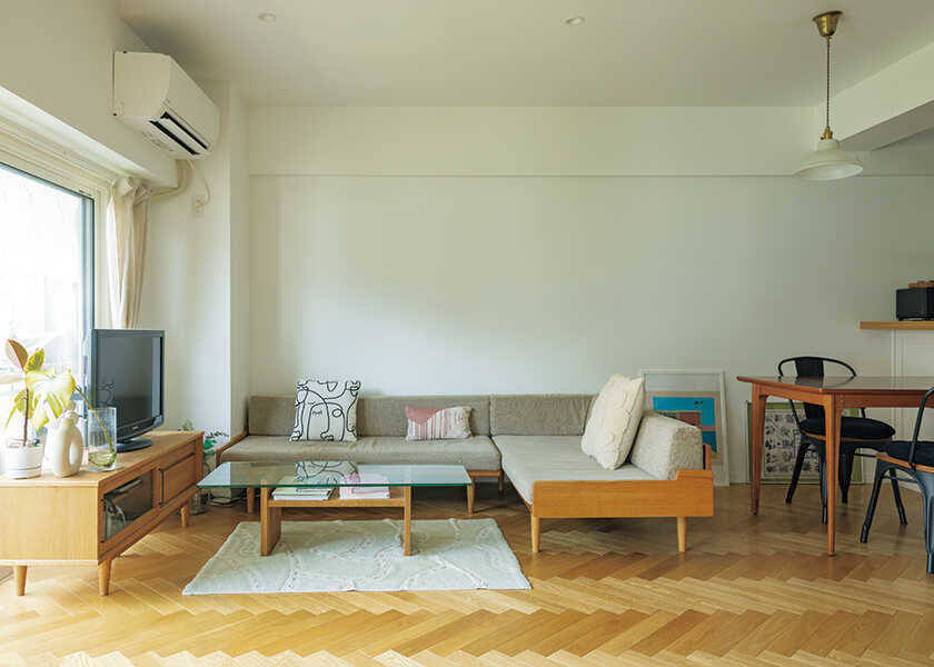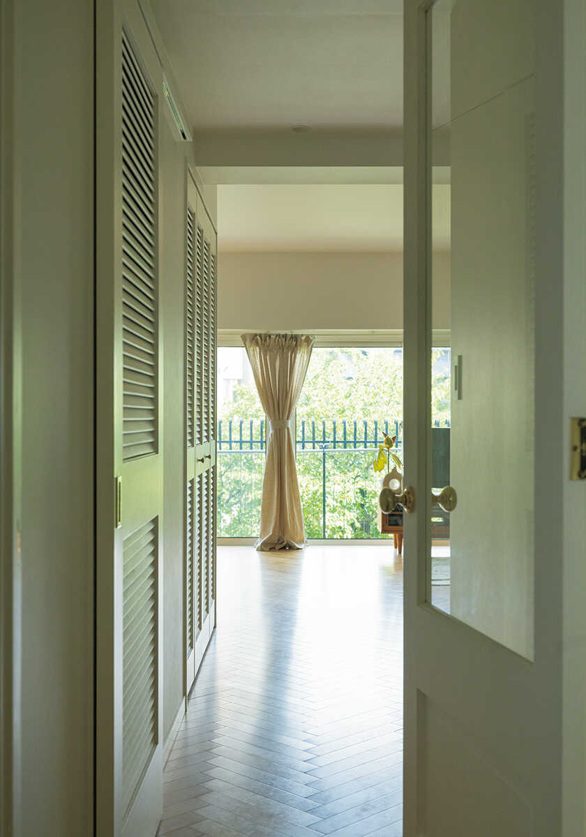 ヘリンボーンの上品な床に、白い壁と天井が映える、明るく上品な空間。厚みのあるクッションやラグが、ほどよい温もりを添え、洗練された空間の中に居心地のよさを感じさせる。キッチンやウォッシュルームなど機能面は充実させつつ、縦張りのタイルや額縁飾りのあるドア・腰壁などクラシカルな意匠が、歳月を経た建物の持つ落ち着いた雰囲気と響き合っている。素材や色使いを丁寧に揃えたことで、肩の力が抜けた安らぎが漂う住まいになった。