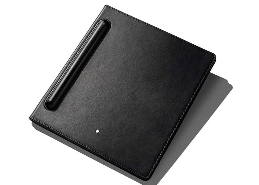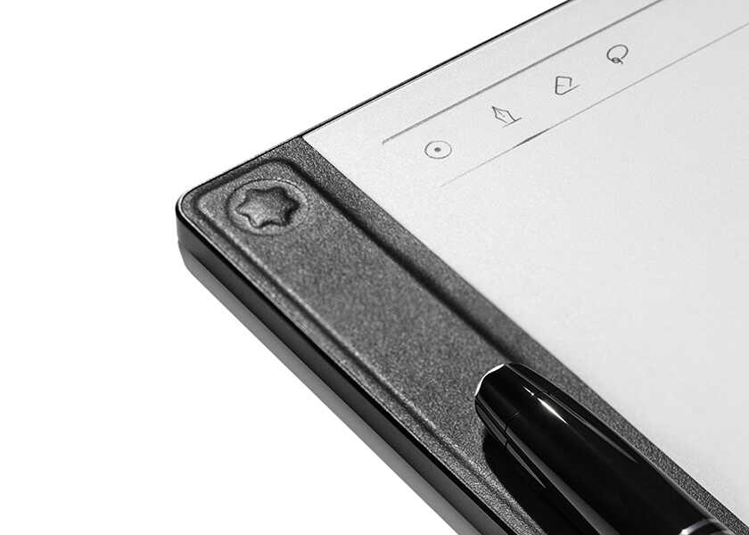 まず、みなさんが気になるのは、ひと目で〈モンブラン〉だとわかるデジタル筆記具だろう。こちらはもちろん、アイコニックな“マイスターシュテュック”の人間工学に基づくデザインをモデルに制作されたもの。3メタルリングや筆記具に冠されたモンブラン エンブレムもしっかり備わっているのは「やはり」といった感じだ。