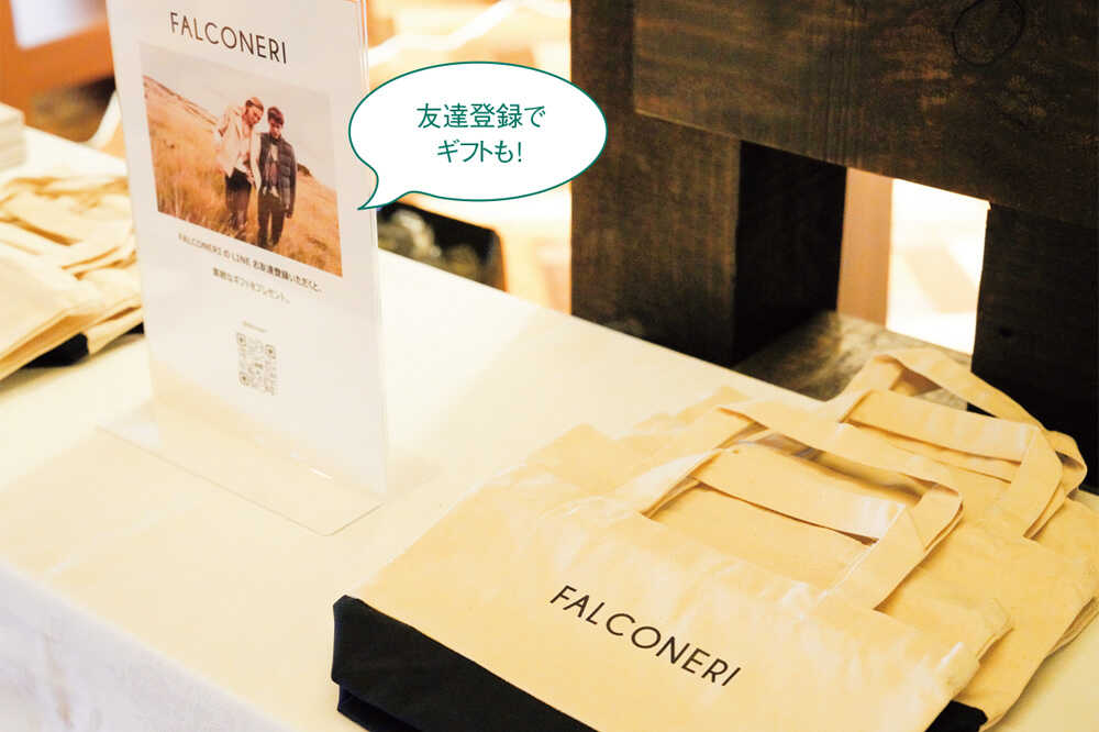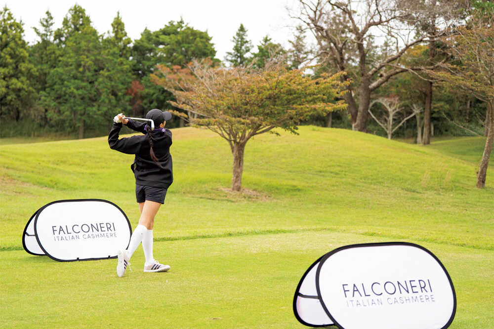 7番ショートホールは上質なカシミヤニットで知られるイタリア発のブランド〈ファルコネーリ〉が提供するニアピンホールに! ニアピン達成者には、表彰式で人気のカシミヤニットが贈られた。またクラブハウスのブースでは、LINE友だち登録でギフトの提供も!