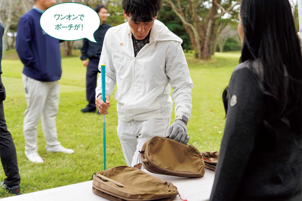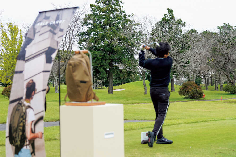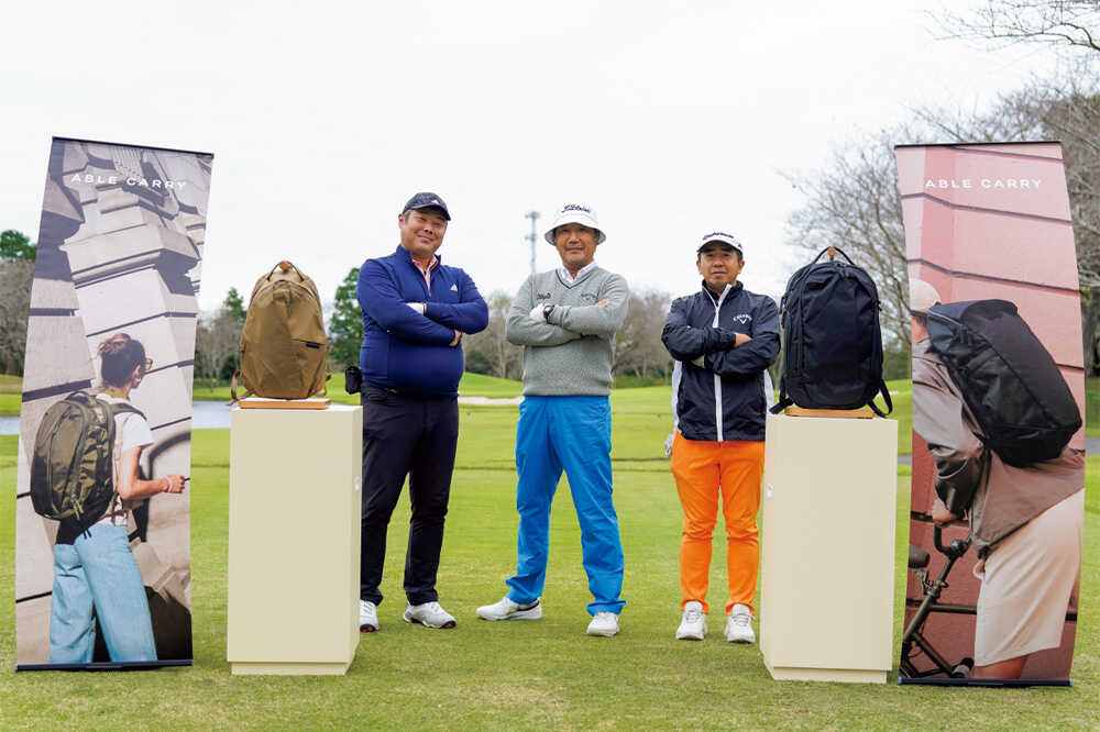 グリーン手前の大きな池がプレイヤーにプレッシャーをかける11番ショートホールは〈エイブルキャリー〉協賛ホールに。このホールでは機能性抜群の〈エイブルキャリー〉のバックパックがティーグラウンドに展示されたほか、グリーン上の指定位置に見事ワンオンしたプレイヤー全員に、特製のポーチがプレゼントされた!