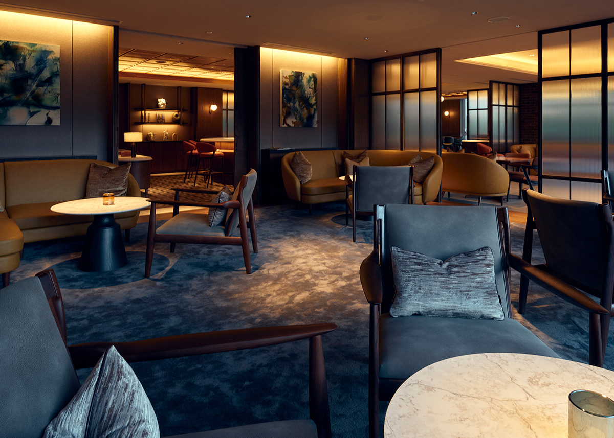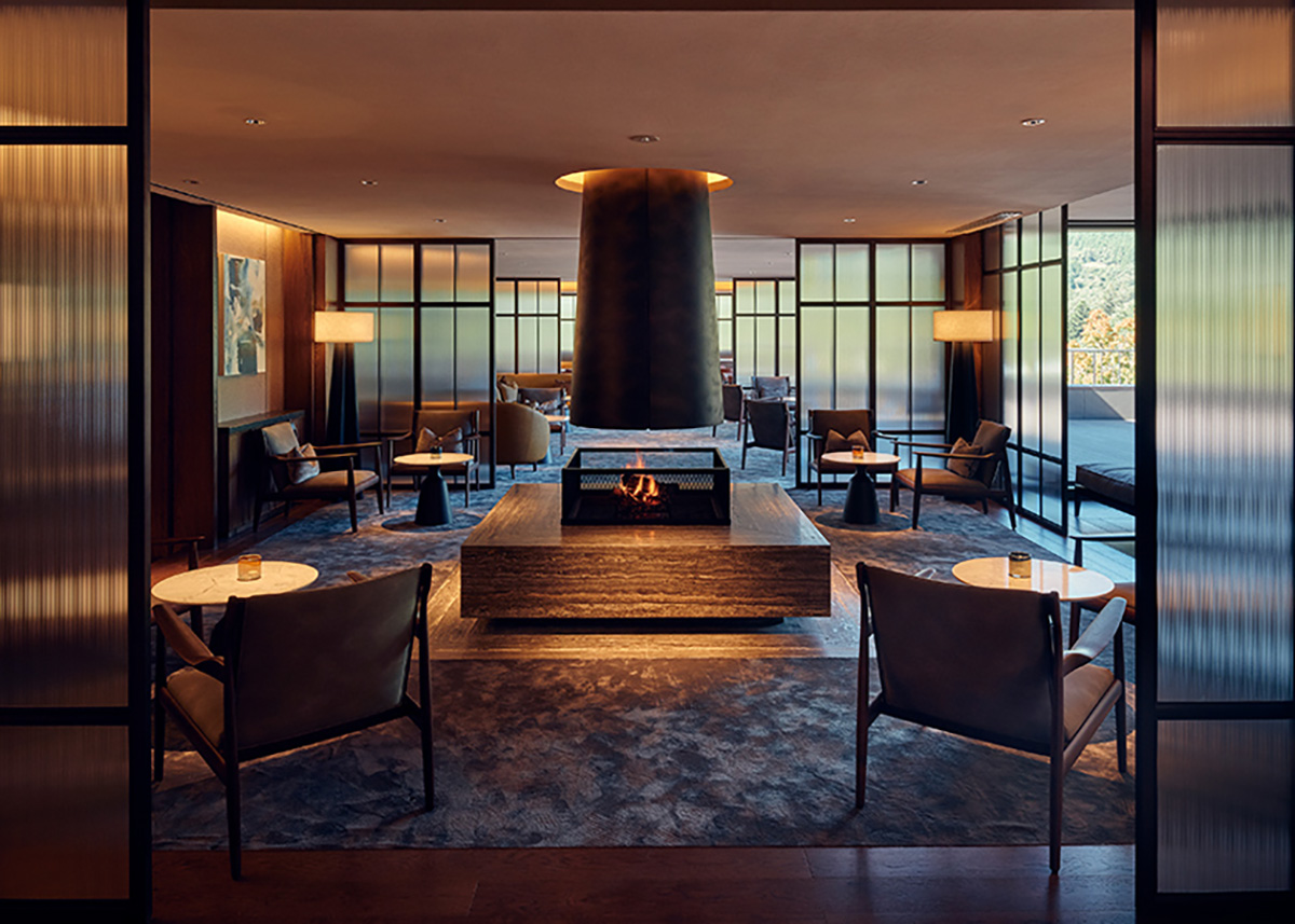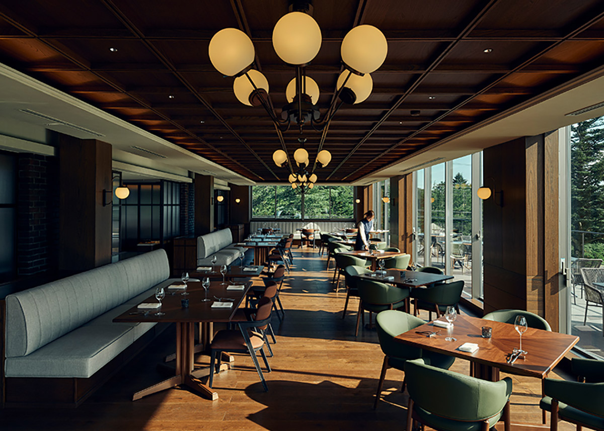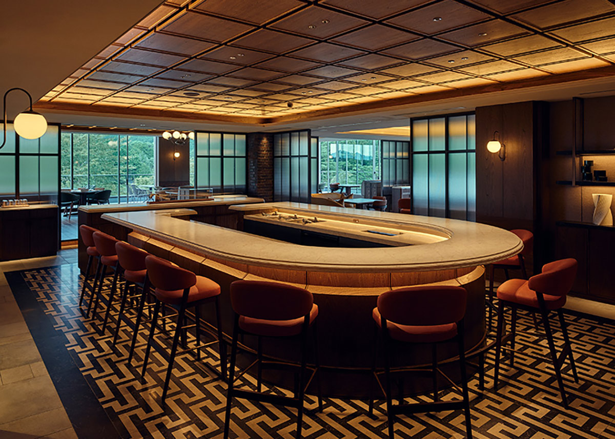 "GORA KADAN"の快適さとおもてなしを備えたオールデイダイニングでは、大きな窓の向こうに富士山がそびえる。朝霧がほどけてゆく早朝には刻々と表情を変える雄姿が立ち現れ、日没前には後光が差したような神秘的な光の帯が稜線を縁取る。四季折々で色合いを変える周辺の自然も間近に感じられ、一枚の風景画のように心を満たしてくれる。室内はクラシカルな重厚感とモダンの洗練が共存する設え。煉瓦の温かな陰影と杢(もく)の自然で重厚な風合い、そして大理石の美しい模様が響き合い、欧州のグランド・サロンを思わせる格調高い空気を醸成する。歴史あるクラブハウスの趣に寄り添いながら、現代的な快適性と審美を同居させた、品位あるダイニング体験を是非楽しんでほしい。