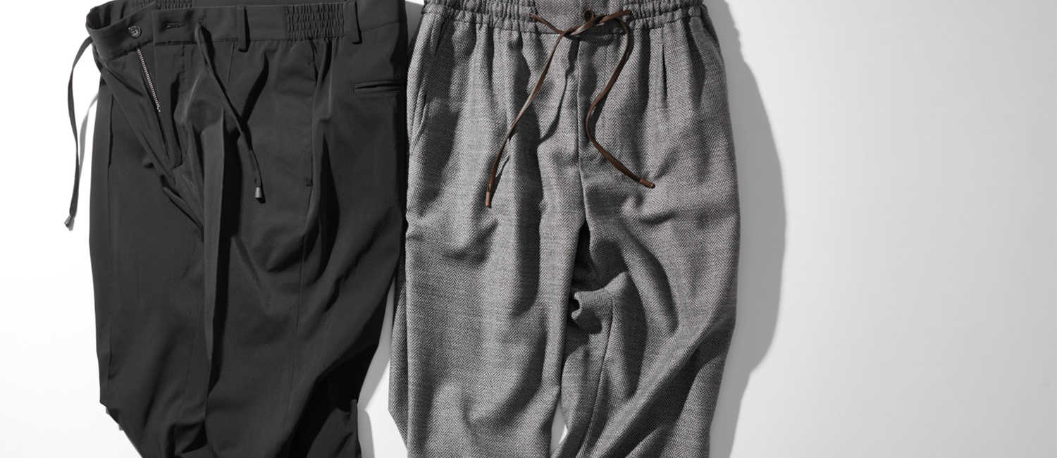 スラックスタイプの“イージーパンツ” 5選!ここ数年、ウエストにドローコードが付いたイージー仕様のボトムが、かなりの勢いで増加中! 従来のようなスウェットパンツだけではなく、カッチリ感のあるスラックスタイプもイージー化。これが大人のデートで重宝するんですよね~。もちろんジャケットに…