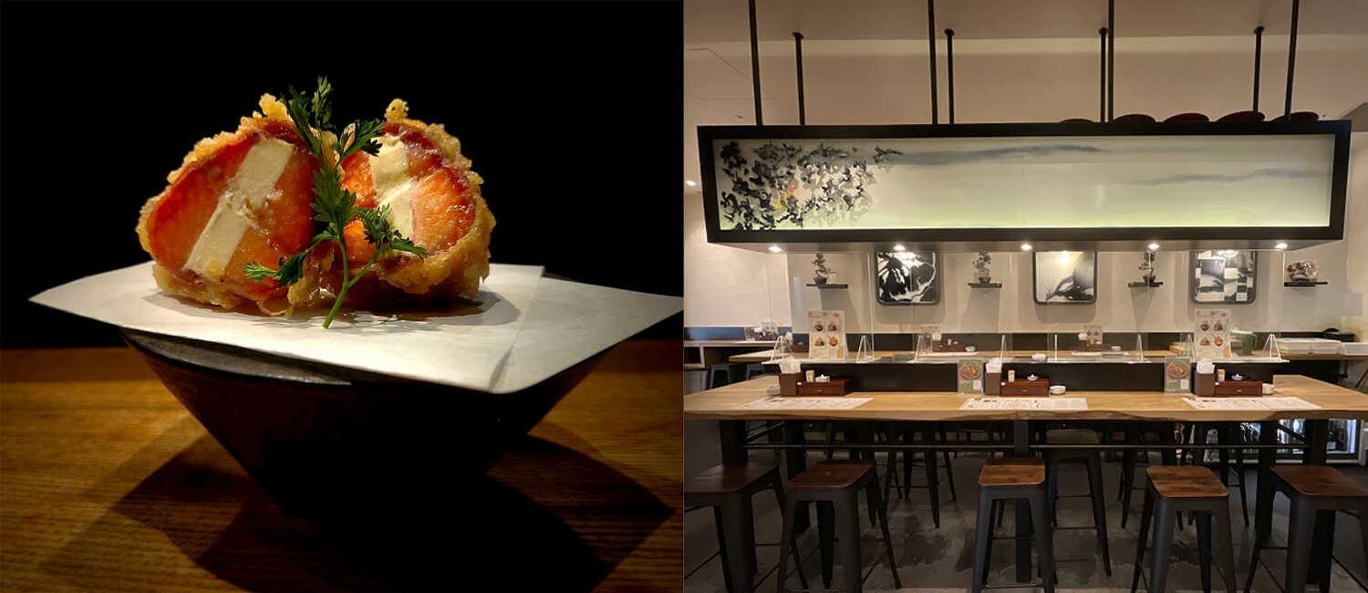 シャンパーニュ&天ぷらを気軽に味わえるのが、バルスタイルの天ぷら専門店〈天ぷら天寅 ミッドタウン日比谷店〉。彼女とカジュアルデートの途中で立ち寄りたい1軒だ。