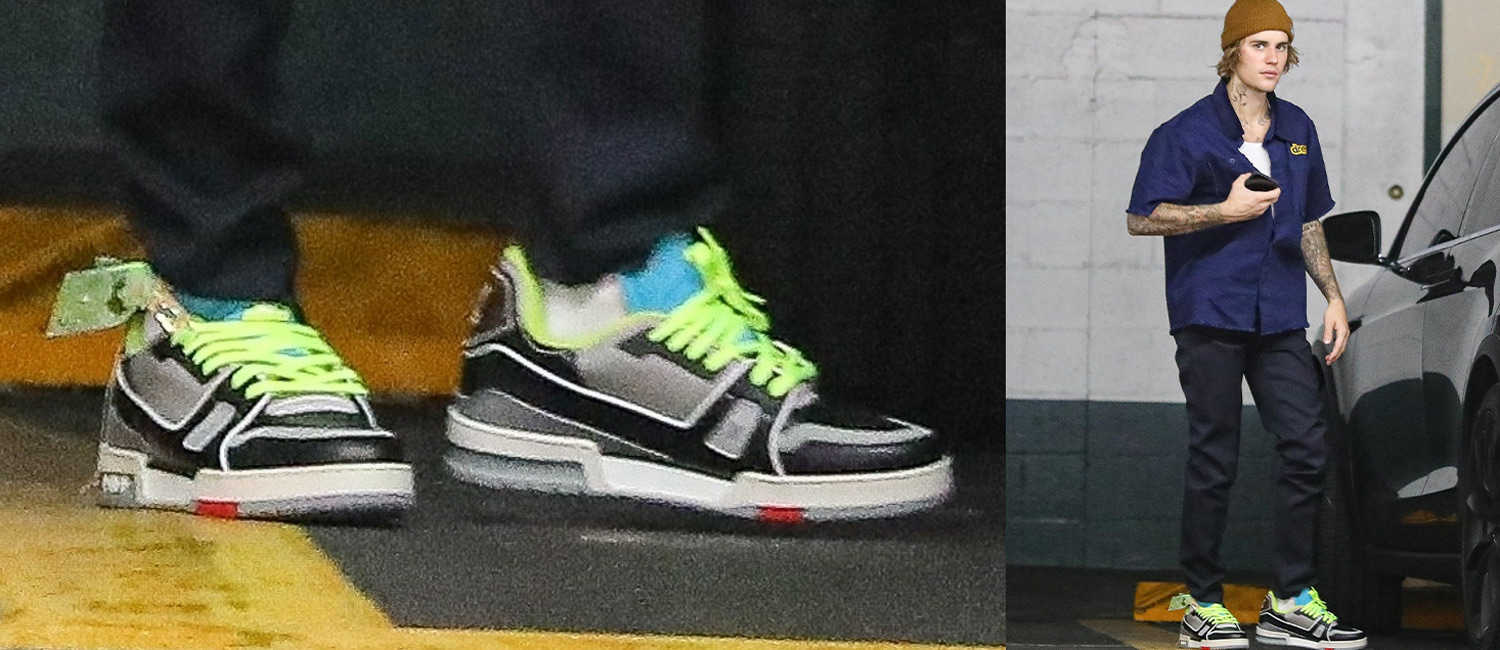 洒落者として知られるジャスティン・ビーバー。この日は、自身が手掛けるブランド〈ドリュー ハウス〉のネイビーの半袖シャツに黒のパンツを合わせ、彼としてはシックな着こなし。と思いきや、足元にはやはり彼らしい遊び心が宿っていた。実はコレ、〈ルイ…