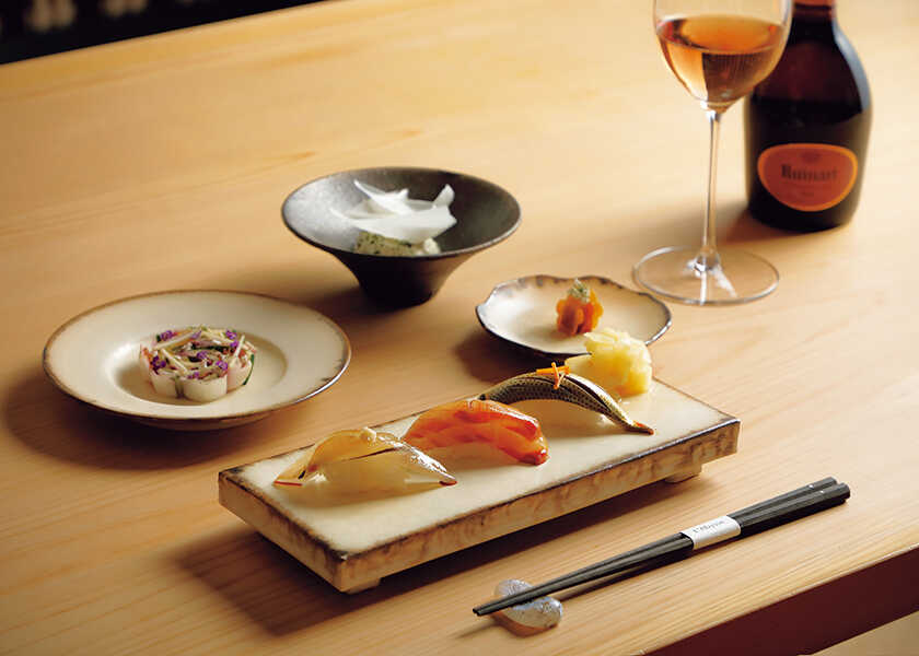 〈鮨ラビス 大阪 ヤニック・アレノ〉の“桜色にきらめく春のおまかせ”コースは、4月30日(木)までの提供。ディナーは1名3万5000円。