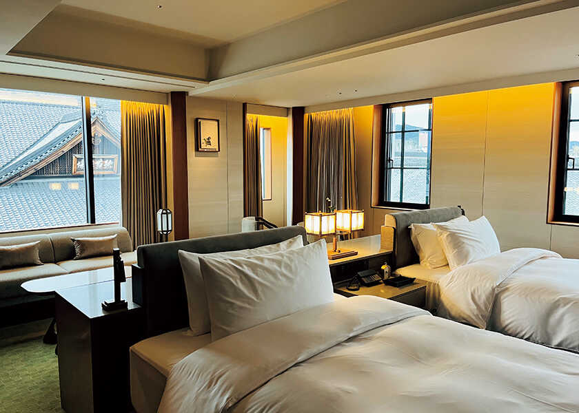 “弥栄会館”の柱や窓枠などの一部を保存した本棟保存エリアの“ヘリテージジュニアスイート”。祇園甲部歌舞練場が眼前に広がり、祇園の非日常空間へ。1室2名で30万4900円~