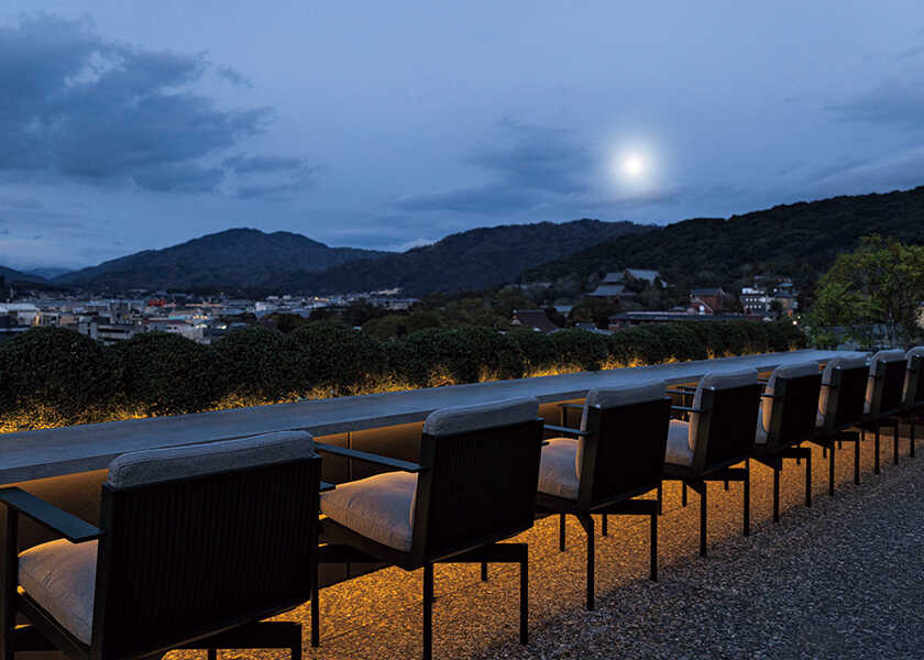 屋上のバー〈ザ ルーフトップ〉の利用は宿泊者のみ。清水寺から比叡山まで見わたせ、五山送り火も複数望める。