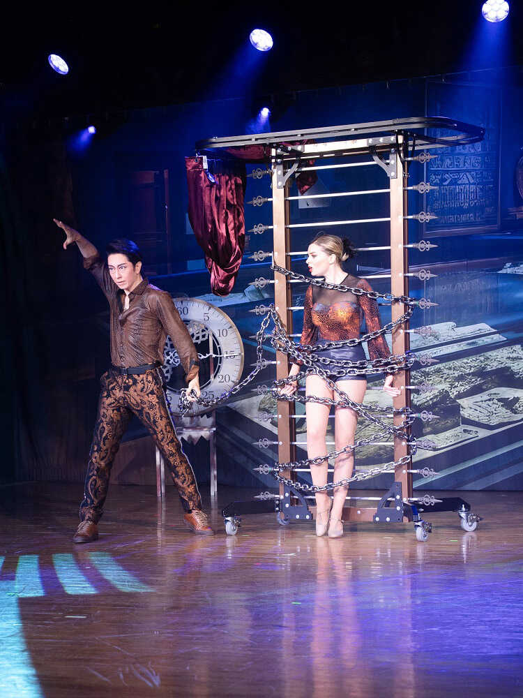 クルーズのお楽しみのひとつは、毎夜、開催される『飛鳥Ⅱ』オリジナルのショー。乗船時の1日目の演目は、新作のイリュージョンマジックショー“ヴォルール・ア・パリ”。