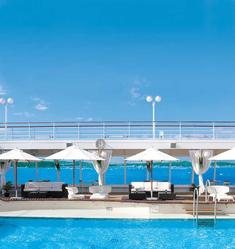 全436室すべてが海側に面しているから客室内でも、そして、乗船中はプールやデッキ、展望大浴場など、あらゆるところで海と空を感じながら過ごせる。