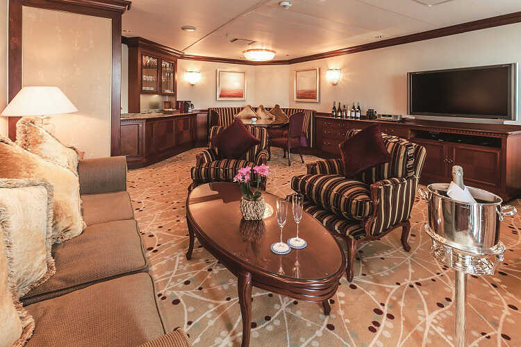 『飛鳥Ⅱ』は12階層で、キャビン(客室)はデッキ7~10の4フロアにあり、10デッキはオールスイート。スイートカテゴリのキャビンには冷えたスパークリングワインとウェルカムフルーツがセットアップされている。