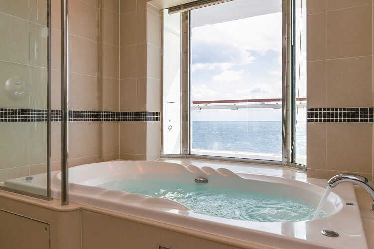 バスルームもオーシャンビュー! 大きな窓からも海と空を望めて過ごす贅沢なひとときを過ごした。