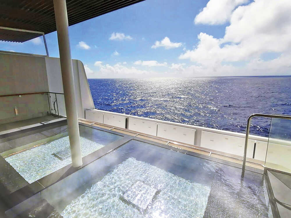 最上階12デッキの展望大浴場『グランドスパ』には、湯に浸かりながら地平線が見渡せる露天風呂もある