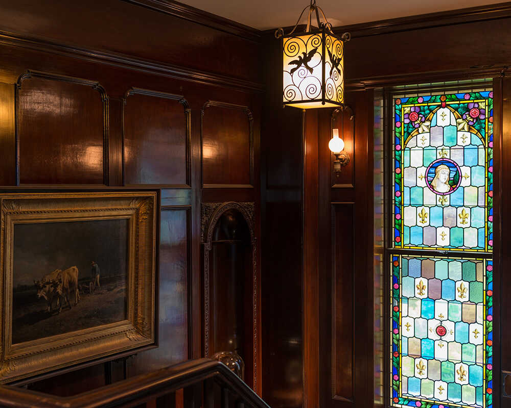 本館『大山崎山荘』は、ヨーロッパから取り寄せたというステンドグラスが印象的な築100年を超える英国風建築。本館をはじめとしたいくつかの建物は登録有形文化財にも指定されており、安藤忠雄設計による展示空間『地中の宝石箱』(地中館)とともに、芸術と建築が融合した独特の美しさを放っている。