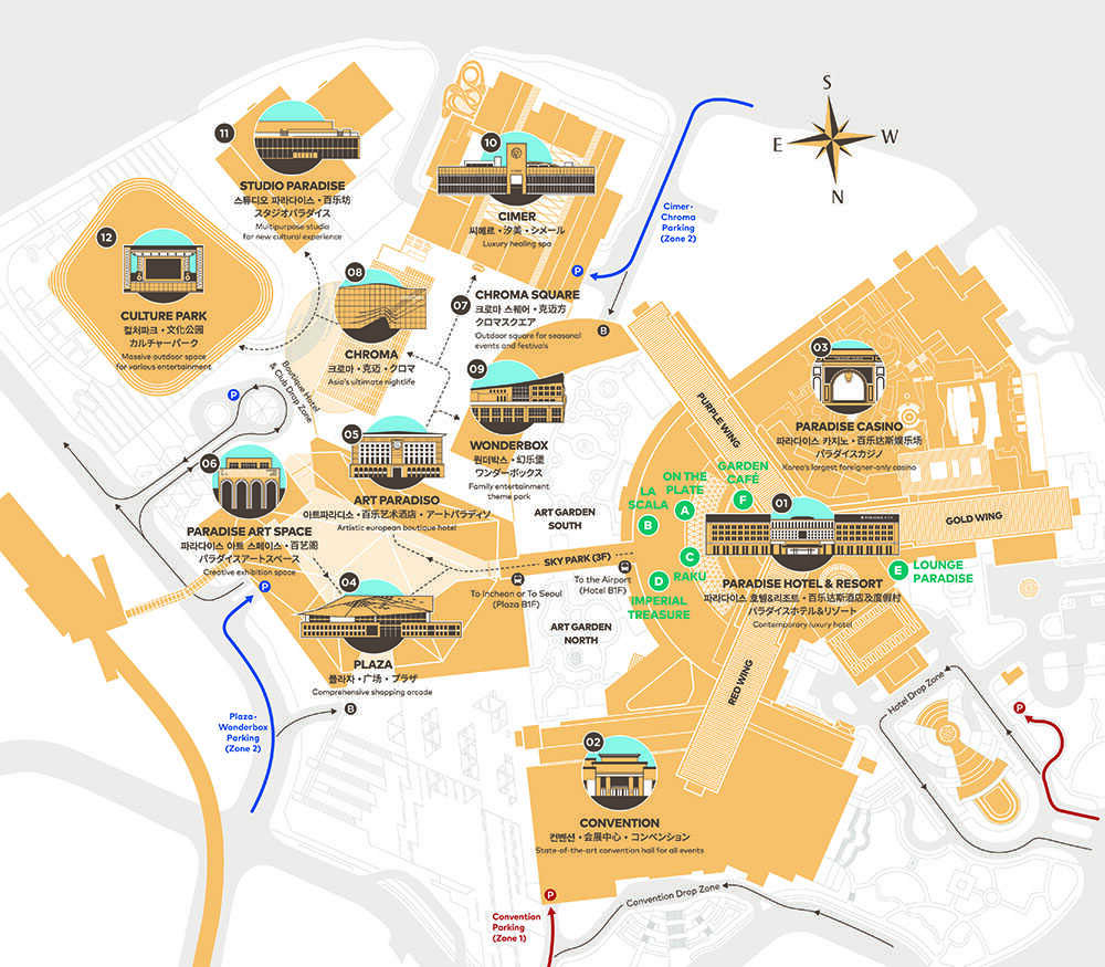 東京ドーム7個分超の広大な敷地の核が「パラダイスホテル&リゾート」、そして全室スイートルームで構成される「アートパラディソ」。それぞれ異なる魅力を持つホテルは旅のスタイルで選択できる。パラダイスホテル&リゾートは洗練されたエレガントな雰囲気とコンテンポラリーなデザインの5ツ星ホテル。ホテルドロップゾーンに直結し、中央で放射線状に3つのウィング(レッド、パープル、ゴールド)に分かれている。レッドは会議やパーティなどの会場に近く、スパ施設を併設。パープルはボーリング場を併設し、ワンダーボックスと連結したファミリー向け。そしてゴールドはカジノへ行きやすく、ジム、サウナ、プールを併設し、専用のVIPエントランスも備える。一方ショップやレストランが集合し、イベントも開催される「プラザ」に隣接しているアートパラディソは、全客室がスイートルームという大人専用デザイナーズホテル。ホテル内にはモダン韓国料理が楽しめるレストラン「セラセ」が。ラグジュアリースパ「シメール」はリラックスを目的にする贅沢ステイにうってつけな設備を多く備え、どちらのホテルからも通いたくなる素晴らしさに満ちている。