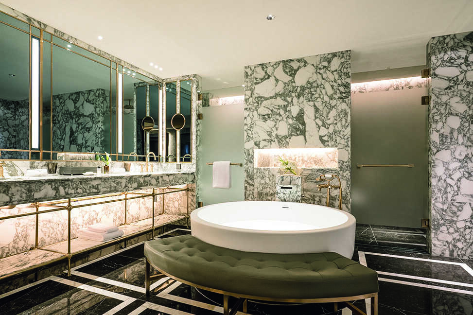 大理石をふんだんに使用した、ラグジュアリーなバスルーム。バスタブはカップルで浸かっても余裕の広さ