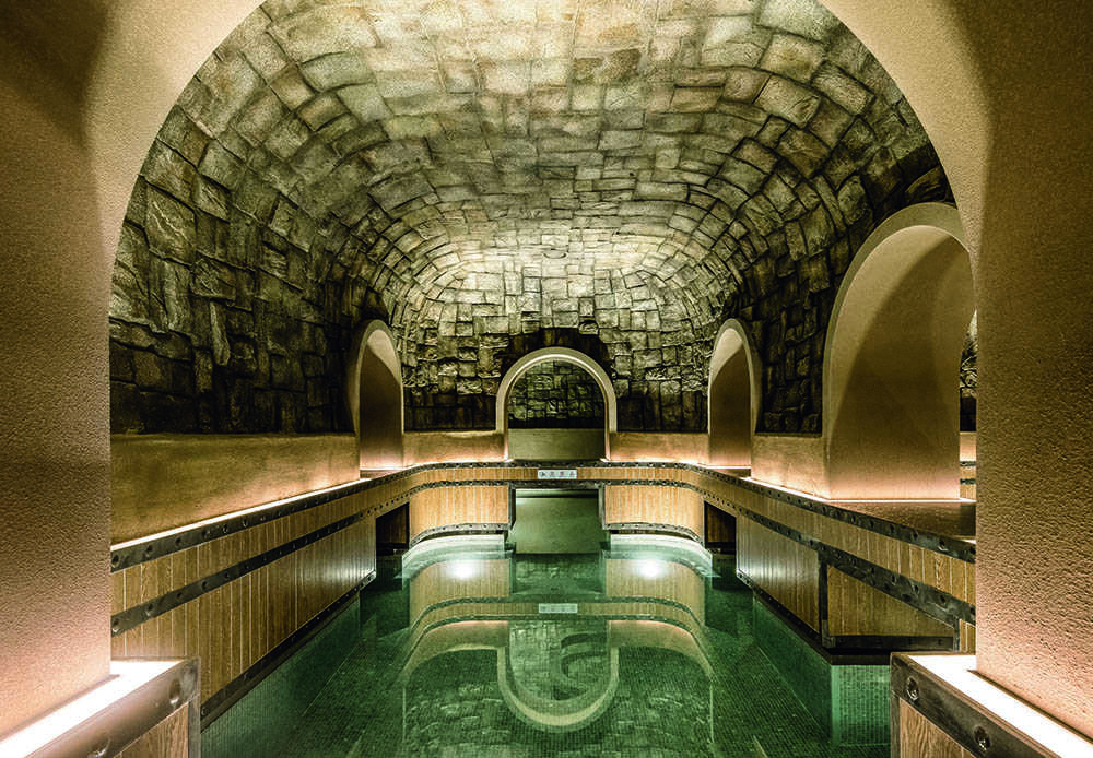 高い天井と暗い照明が調和した「ケイブスパ」、周囲の喧騒も遠のき洞窟の中に迷い込んだよう