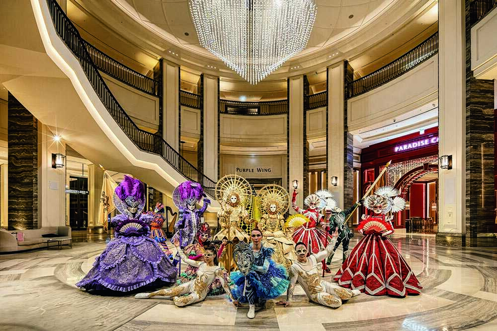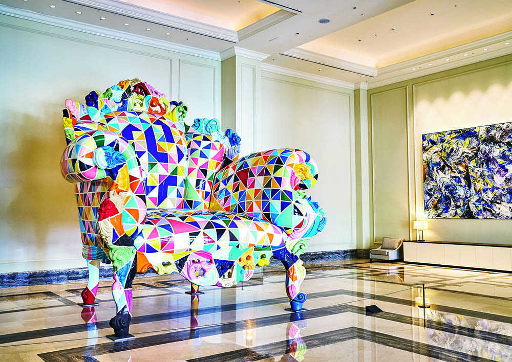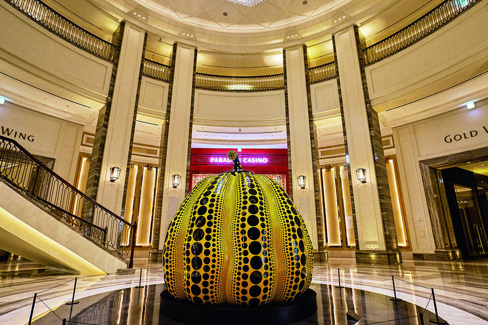 ホテルに入り、まず目に飛び込んでくるのは表紙の作品、ダミアン・ハーストの『ゴールデン・レジェンド』。続いて、吹き抜けの中央に鎮座する草間彌生の『GREAT GIGANTIC PUMPKIN』。現代美術の二大アイコンの作品を一度に鑑賞できる、超絶なファーストインパクトからパラダイスシティの滞在ははじまる。ココは様々な芸術的価値を融合した施設をはじめ、至るところで輝きを放つ3000点余りのアートワークを通じてアートテインメントコンテンツを提供する場所。どの施設を利用しても息をのむ感動が待っているのはもちろん、移動するだけで次々と発見が生まれ、五感が喜ぶ体験が押し寄せる。そしてそこに流れるのが、芸術と科学、東洋と西洋、過去と未来など、相反する価値が響き合う洗練されたハーモニー。旅行者の時間を芸術に変えてしまう、それがパラダイスシティだ。