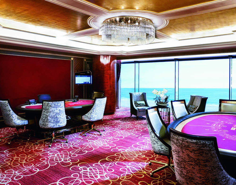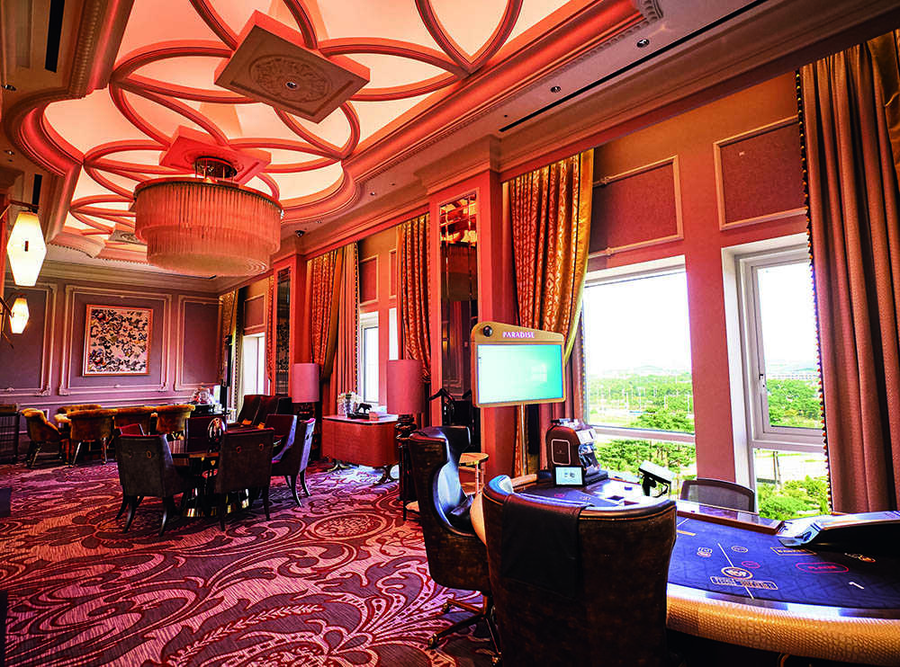 地上8階、この絢爛豪華なゲーム空間でプレイできるのは、ごくひと握りのVIPのみ。 卓を仕切るディーラーもベテランだ。 窓外には黄海を染める夕焼け、壁には絵画。アートを愛でながら、優雅に過ごすことができる。まさにステイタス