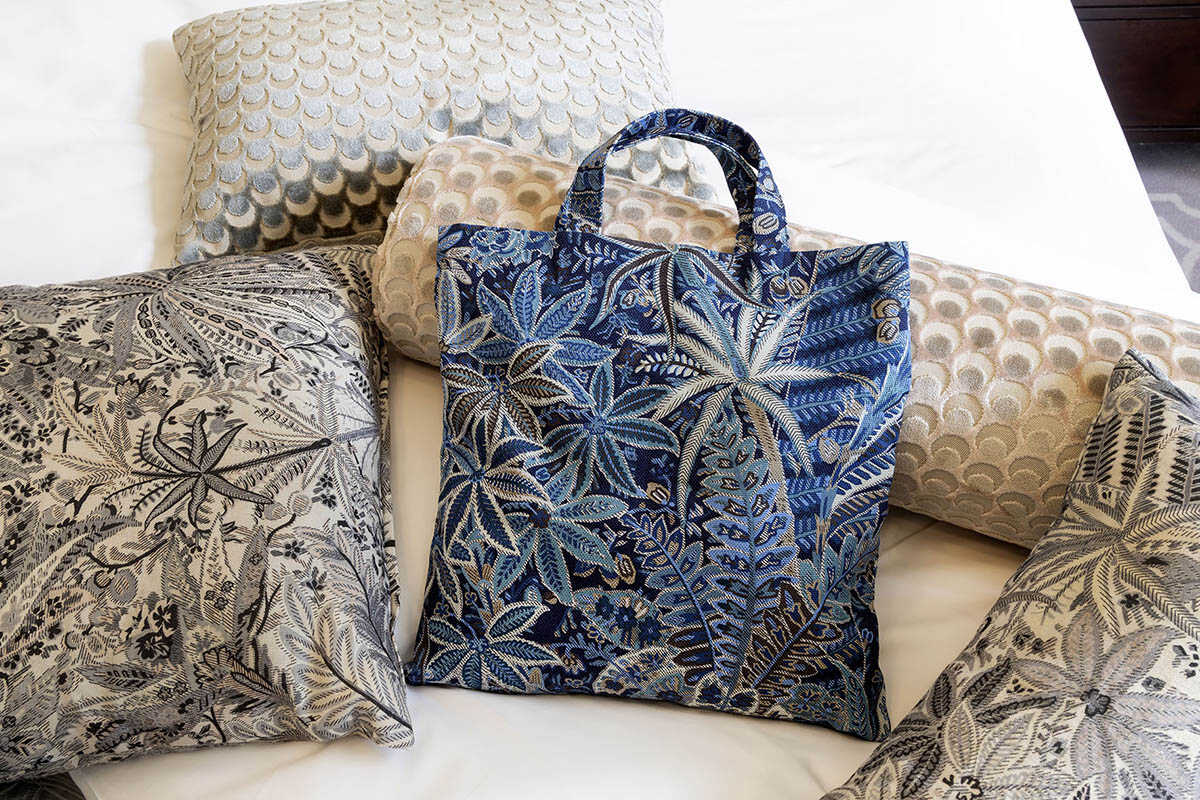 A4サイズがすっぽりと収まる〈リバティ〉ファブリックのトートバッグもプランに含まれている