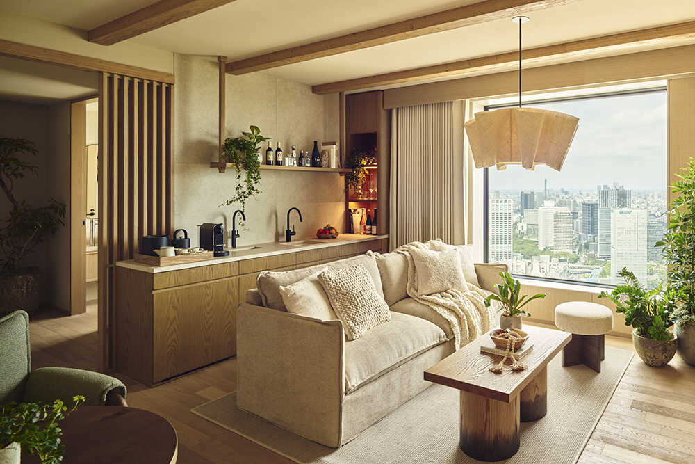 客室は全211室。ペントハウスを含むスイート24室に加え、ユニバーサルルームも完備する。再生素材を使ったアートや、地元職人によるインテリアなど、どの部屋も一貫しているのは自然体でいられること。夜、東京の灯りを眺めながら過ごす時間は、“何もしない贅沢”を思い出させてくれるに違いない。