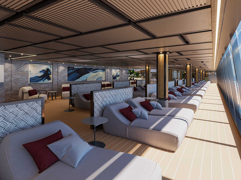 本船は、単なる“新しい豪華客船”ではない。目指したのは、移動手段としてのクルーズを超えた、滞在そのものが旅の目的となる“洋上の住まい”。全長を19.2m拡張しながらも、あえてゲスト数を抑える設計。その結果、ゲスト1名あたり約19.5㎡という、業界屈指のパブリックスペース比率を実現した。