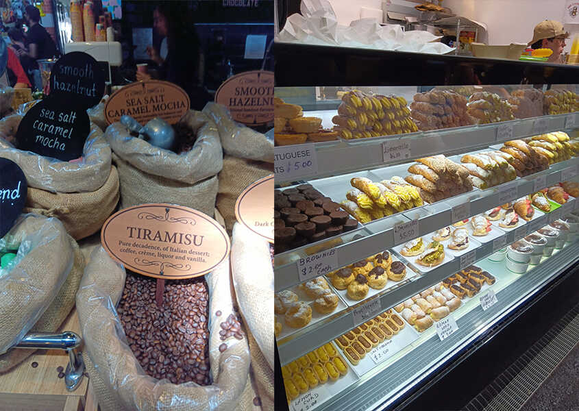 写真左/個性豊かなフレーバーのコーヒー豆が並ぶ専門店。量り売りのほか、テイクアウトのコーヒーも人気。写真右/食べ歩きにぴったりのスイーツも数多く並び、甘い香りがマーケットに広がる