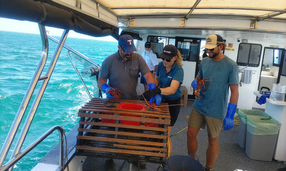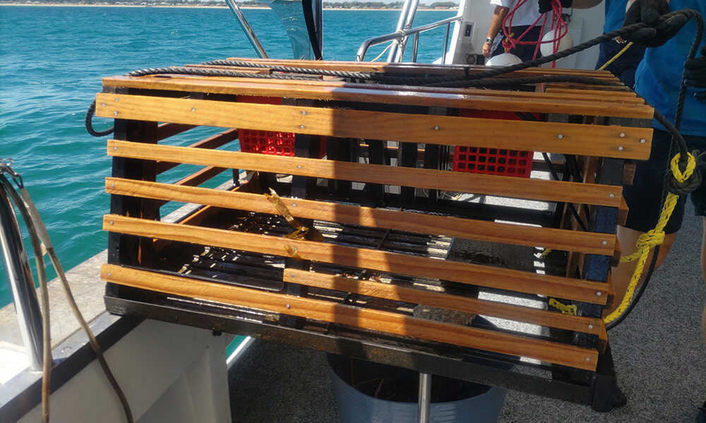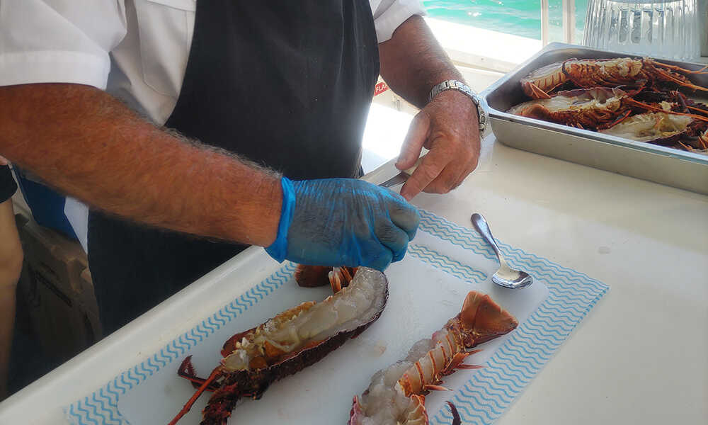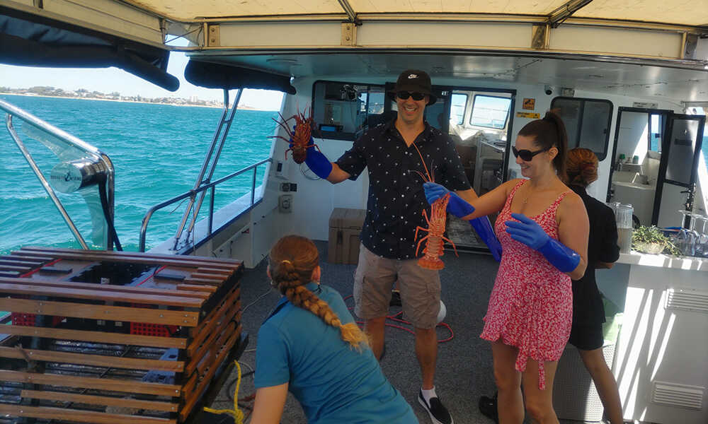 船に揺られて20〜30分程度すぎると、ポイントに到着。クルーが素早く海中に仕掛けられたポットのロープを手繰り寄せていく。ゲストは2〜3人ひと組となり、ゴム手袋を着用しながらスタンバイ。威勢の良いクルーの掛け声とともに、ロープを綱引きの要領で一気にポットを引き上げていく。すると海面から木製のポットが姿を現わし、なかには西オーストラリア州を代表する高級食材ウエスタン・ロックロブスターが! クルーズのハイライトに船内からは歓声が上がり、最大の盛り上がりに!