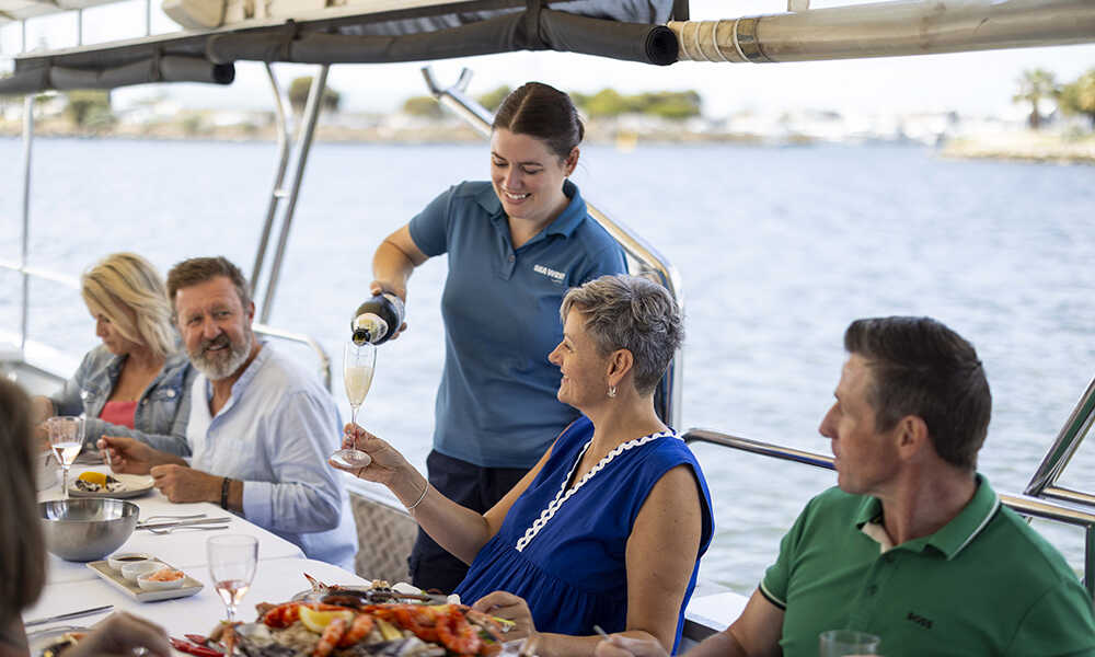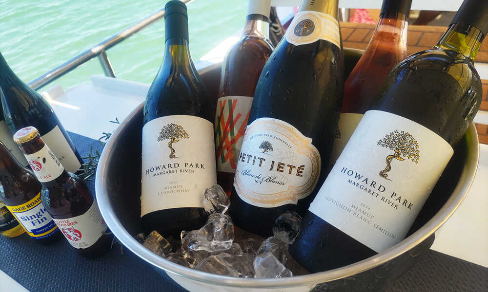食事は下部デッキに準備されたテーブルで供され、マーガレットリバー産のワイン『ハワード・パーク』や、西オーストラリアを代表するブルワリーのビール『ゲージ・ロード シングルフィン』、『リトル・クリーチャーズ』などがフリーフローで味わえる。潮風を感じながらグラスを傾ける時間は、まさに海上ならではの贅沢だ。