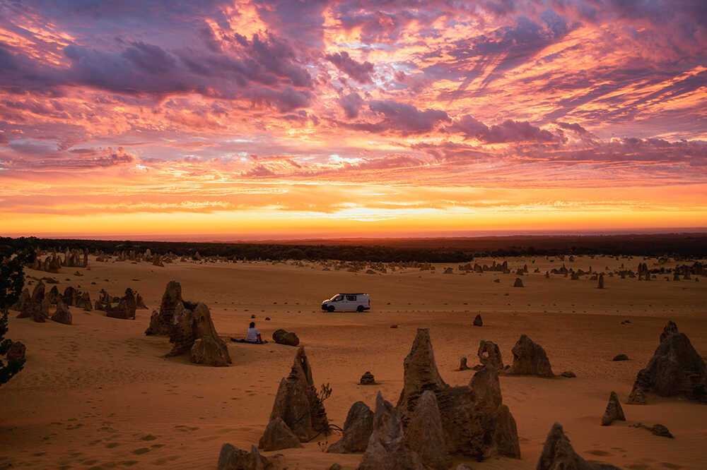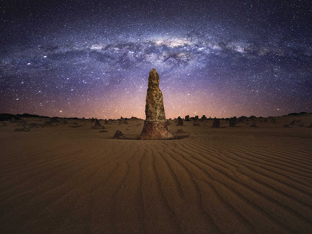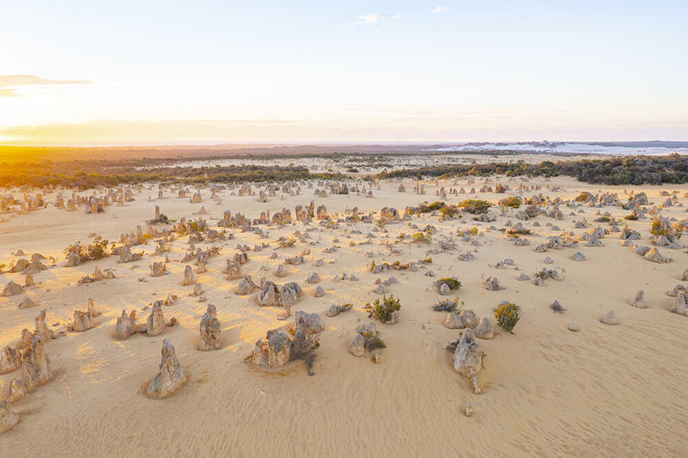 海の余韻を残したまま、今度は北へ約250km。パースからはクルマで約2時間30分、景色は徐々に緑から乾いた大地へと変わっていく。目的地は、ナンバン国立公園にあるピナクルズ砂漠。ここには、ほかでは見ることのできない異形の風景が広がっている。特に、夕暮れから夜にかけて訪れる『サンセット&スターゲイジングツアー』は、この地の魅力を最大限に引き出してくれるプログラム。