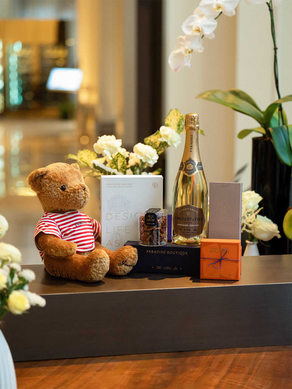 ルームスプレー、ヒノキシャワーセット、パヴェショコラ(4個) 、シグネチャーティー(紅茶&緑茶)、クッキー(1種) 、Paradise Boutiqueオリジナルクリアバッグ